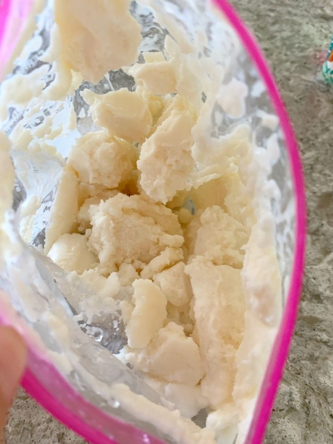 - Shake it: Now shake, squeeze, rotate, and toss that bag for about 7 to 10 minutes. Don’t stop — this is where the magic happens. It helps to wear gloves or wrap the bag in a dish towel because it gets cold fast.