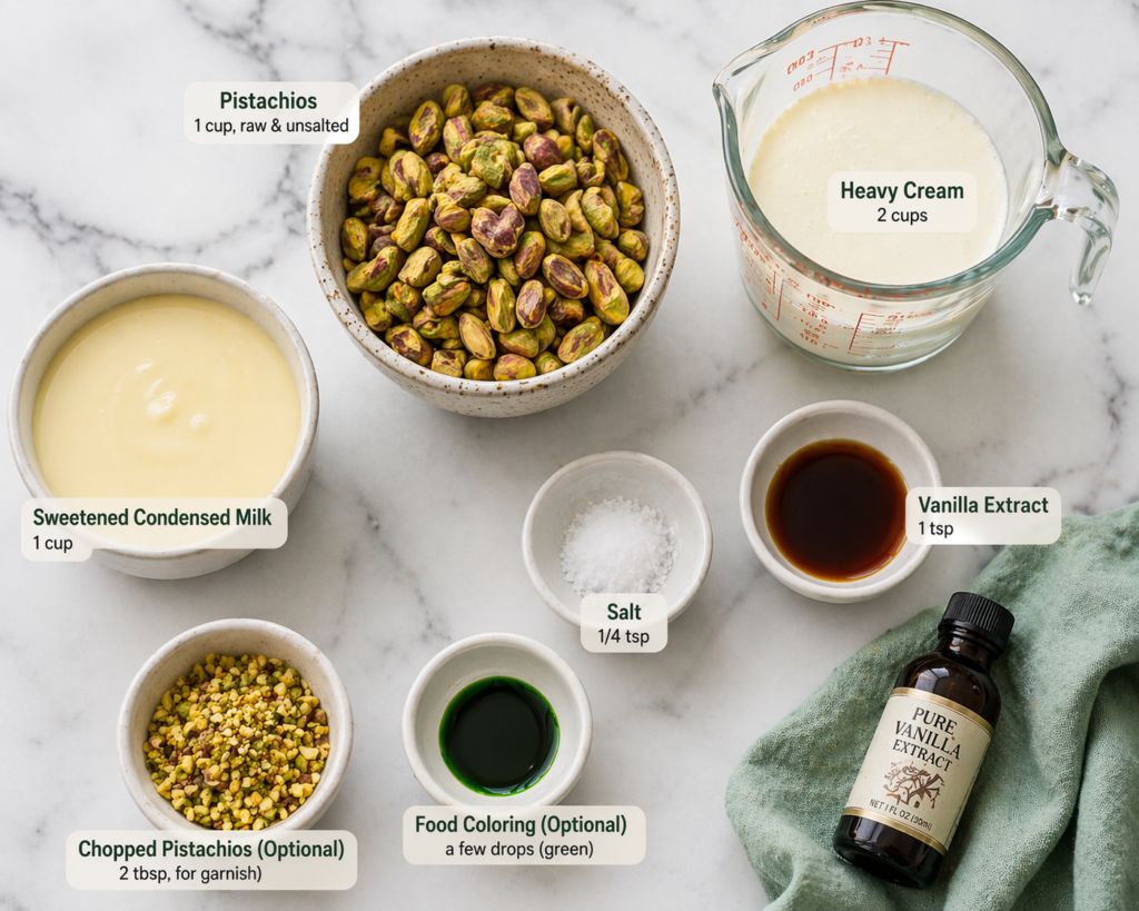 Here’s everything you need for this no-churn pistachio ice cream recipe (serves about 6β8):